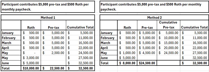 The following example demonstrates Deemed Election Methods 1 and 2 side by side for a participant who contributes $500 Roth dollars and $5,000 pre-tax dollars from each monthly paycheck, a non-compliant affirmative election:
