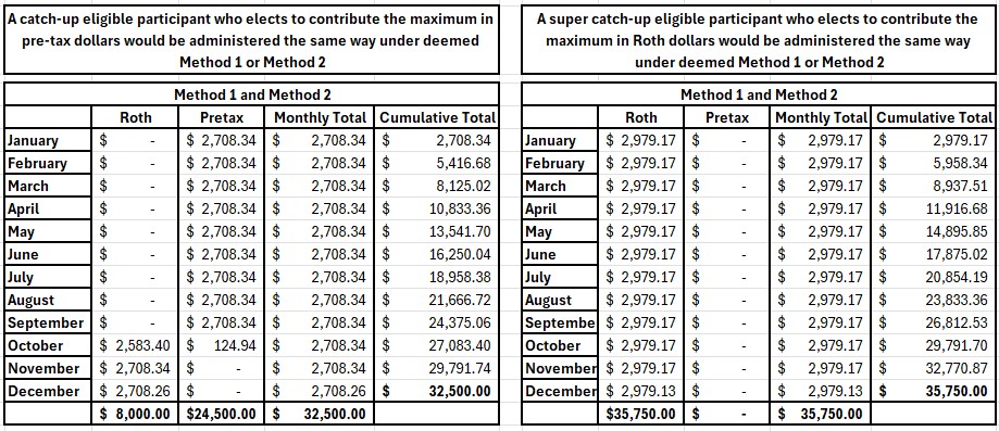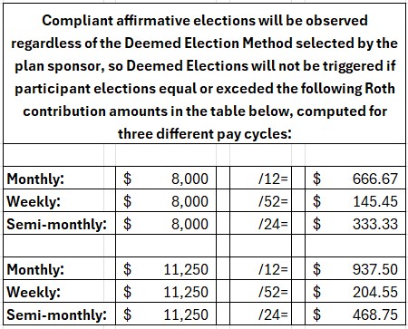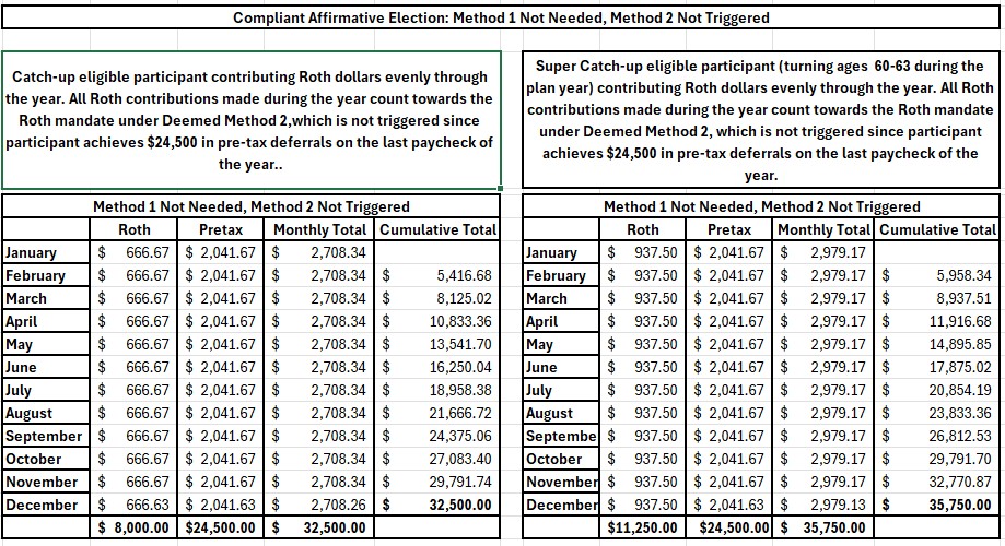 If the Roth catch-up eligible participant had made a compliant affirmative election requesting minimum Roth contributions of $666.67 per month or $937.50 for a super-catchup eligible participant, then there would be no reason for the plan sponsor to use either one of the Deemed Election Methods, since the participant will comply with the mandate using the affirmative election submitted.